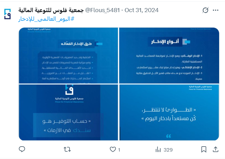 اليوم العالمي للإدخار 2024م       الإدخار هو الأساس لبناء مستقبل مالي آمن .       التخطيط الجيد يبدأ بميزانية واضحة وادخار مستمر       النجاح المالي يبدأ بإدارة نفقاتك بحكمه       الإدخار ليس تضحية بل أسلوب حياة حكيم ومدروس       الإستثمار يبدأ بخطوة صغيرة، الإدخار المنتظم       الإدخار يبني جسراً بين الحاضر والمستقبل       ابدأ بالادخار اليوم لحرية مالية ولمستقبل مالي آمن .